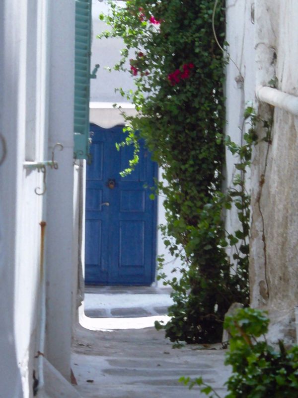 Photo: A shady lane in Mikonos, Greece, featuring a door of cobalt blue, a popular color throughout the Greek Isles.